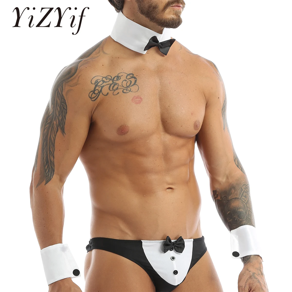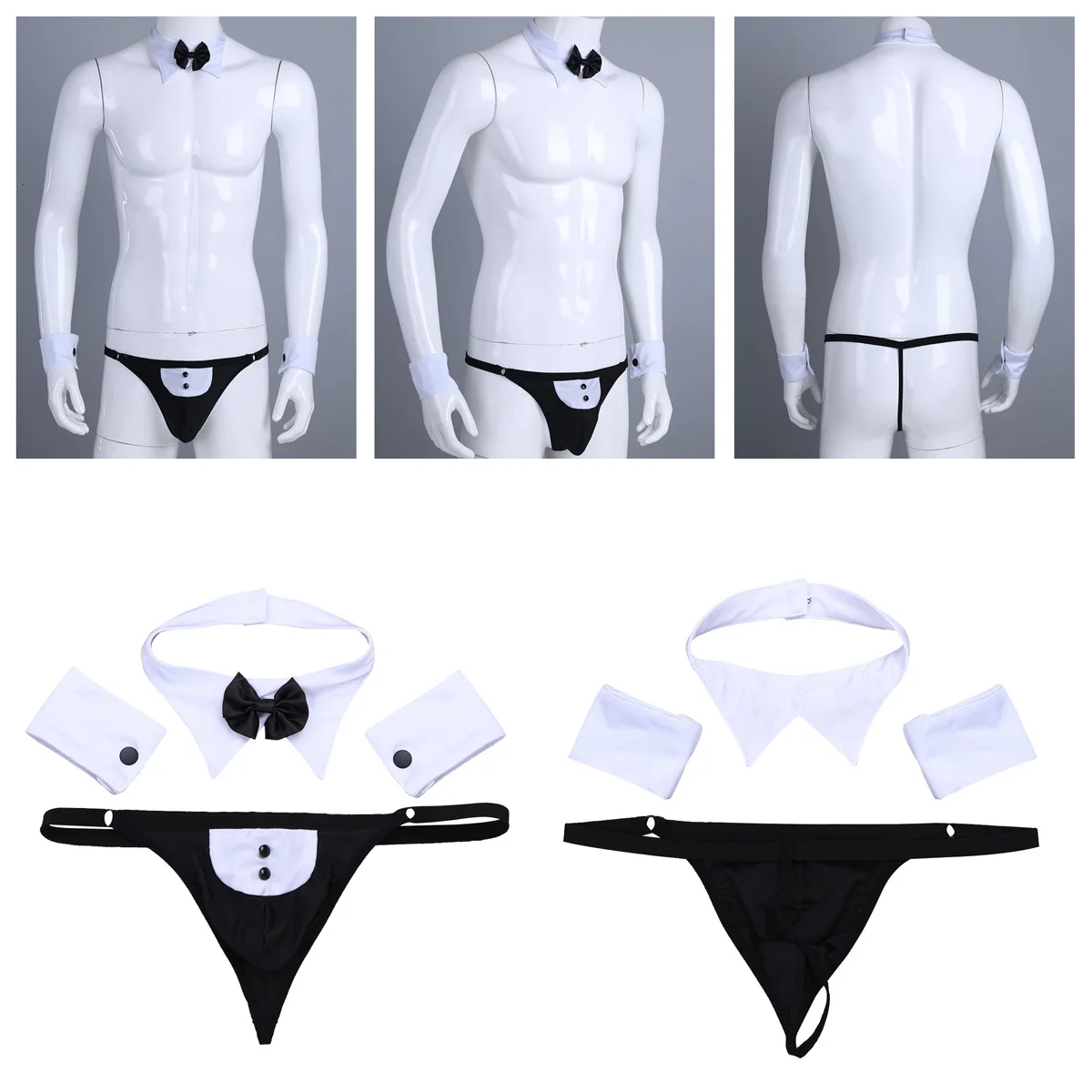 Costume de lingerie smoking pour homme fantaisie, comprenant un string G-string, une paire de bracelets et une pièce de cou.
